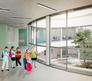 Gli ambienti interni, il percorso e l’area esterna fluiscono su tutto l’edificio, sono stati dunque concepiti insieme, c’è sempre questo rapporto diretto tra bambini, scuola e natura, Una scuola viva, dove la natura possa entrare e guidare lo sguardo, dove penetri la luce filtrata dalla vegetazione circostante e dunque mutevole nei colori e nei toni secondo il ritmo delle stagioni.