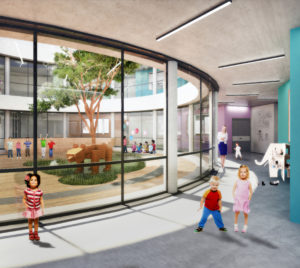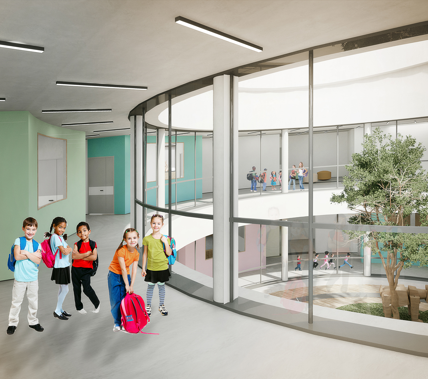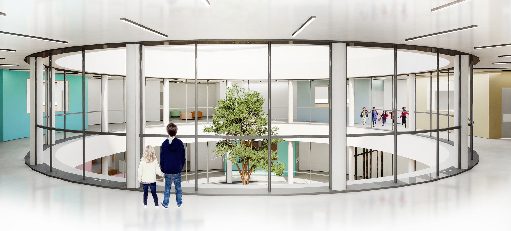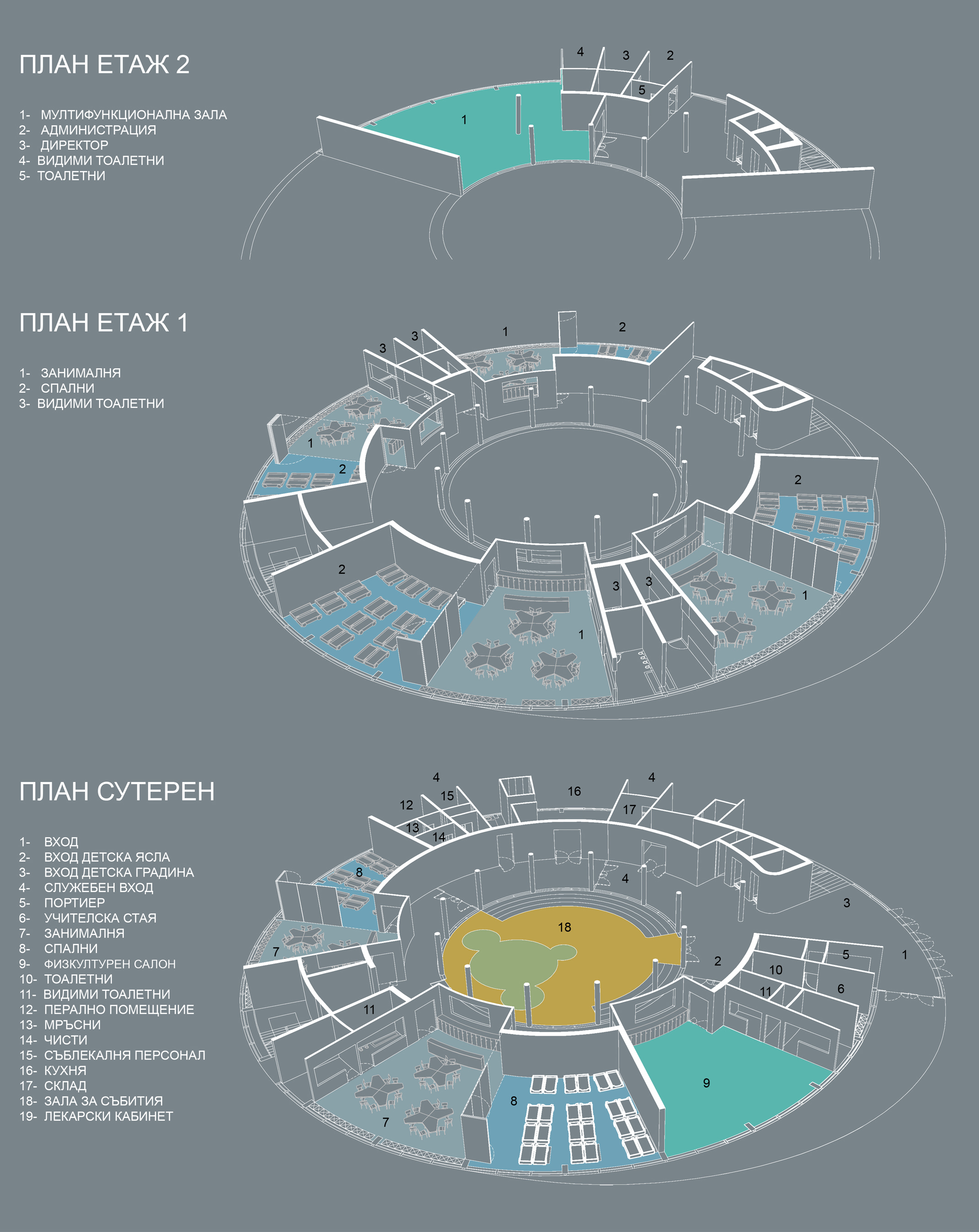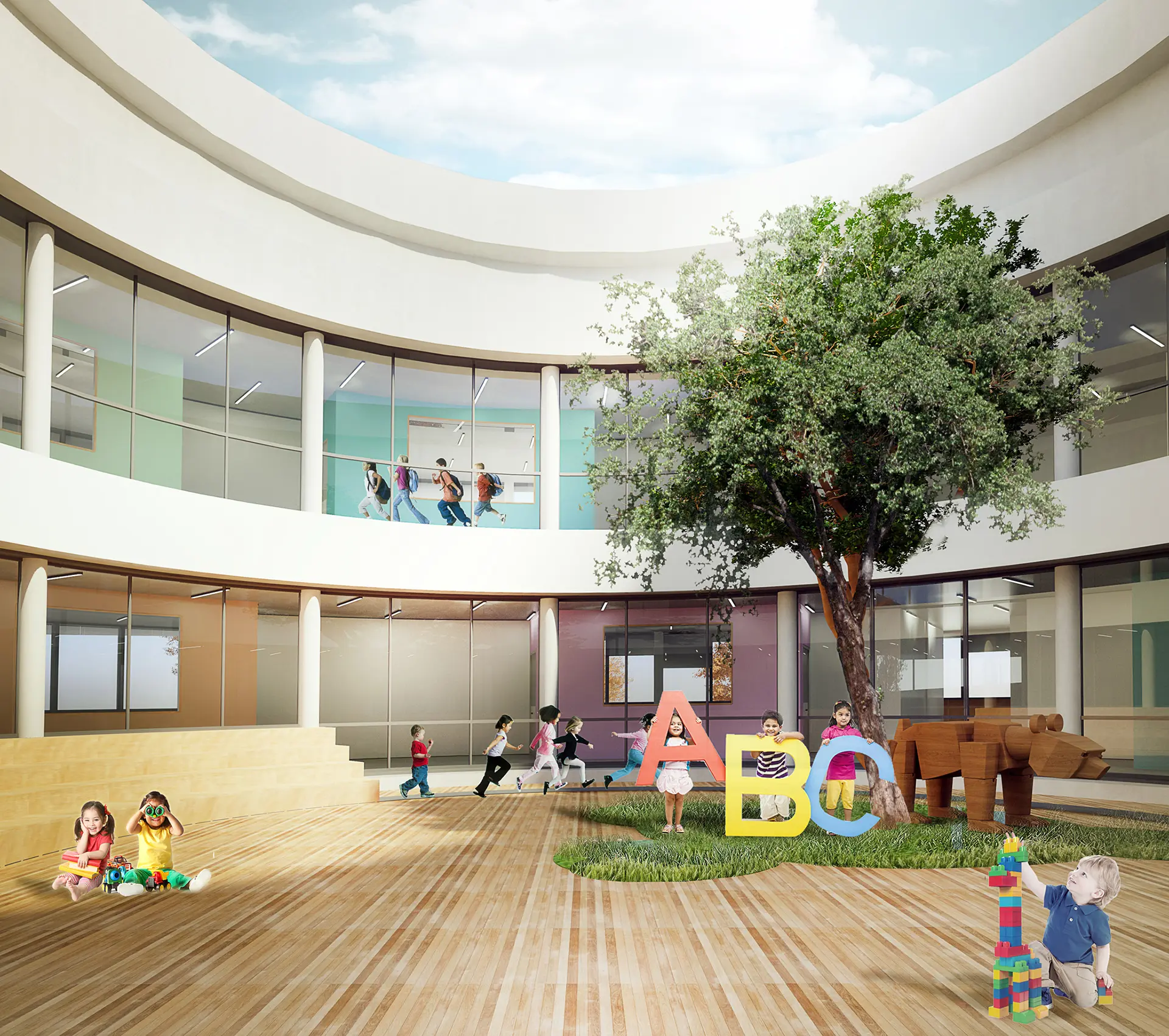 Il progetto è pensato per stimolare l’interazione del bambino con lo spazio fluido che lo avvolge secondo una visione “pedagogica”. gli spazi per la didattica sono stati progettati con pareti mobili per ingrandire o rimpicciolire gli ambienti in base alle esigenze del bambino ( sala studio-bagni-dormitori) invece gli spazi riservati alle esperienze pratiche di laboratorio, riservati al gioco e alla socializzazione, sono raccolti sia attorno ad un’ampia agorà centrale, sia all’esterno che incarnano il luogo della condivisione e del confronto con le realtà esterne al contesto scolastico.