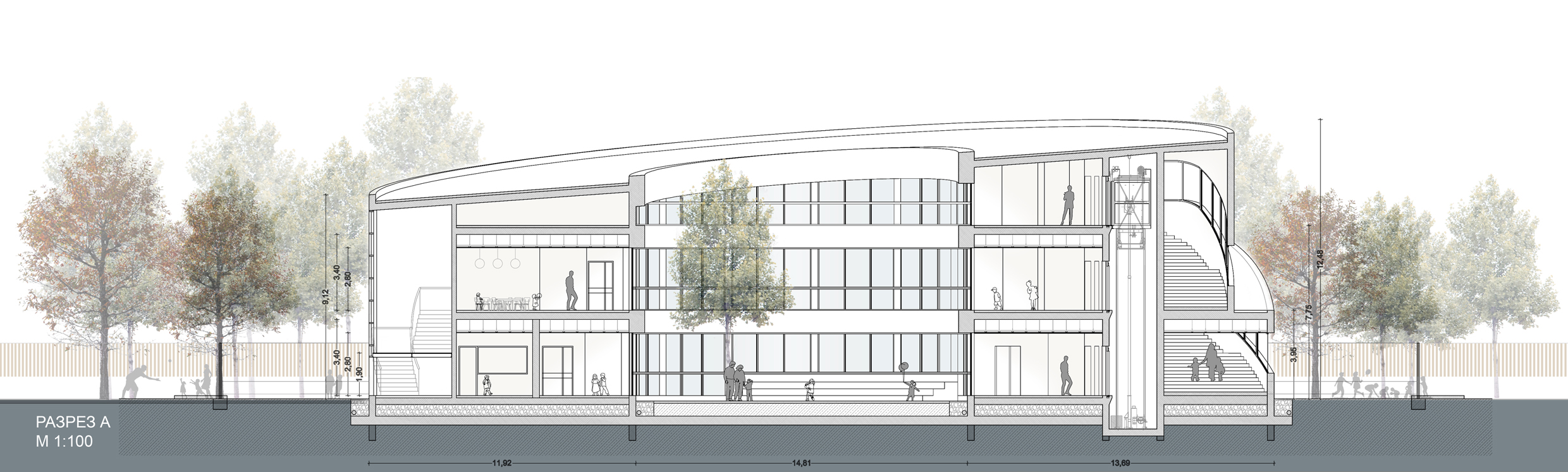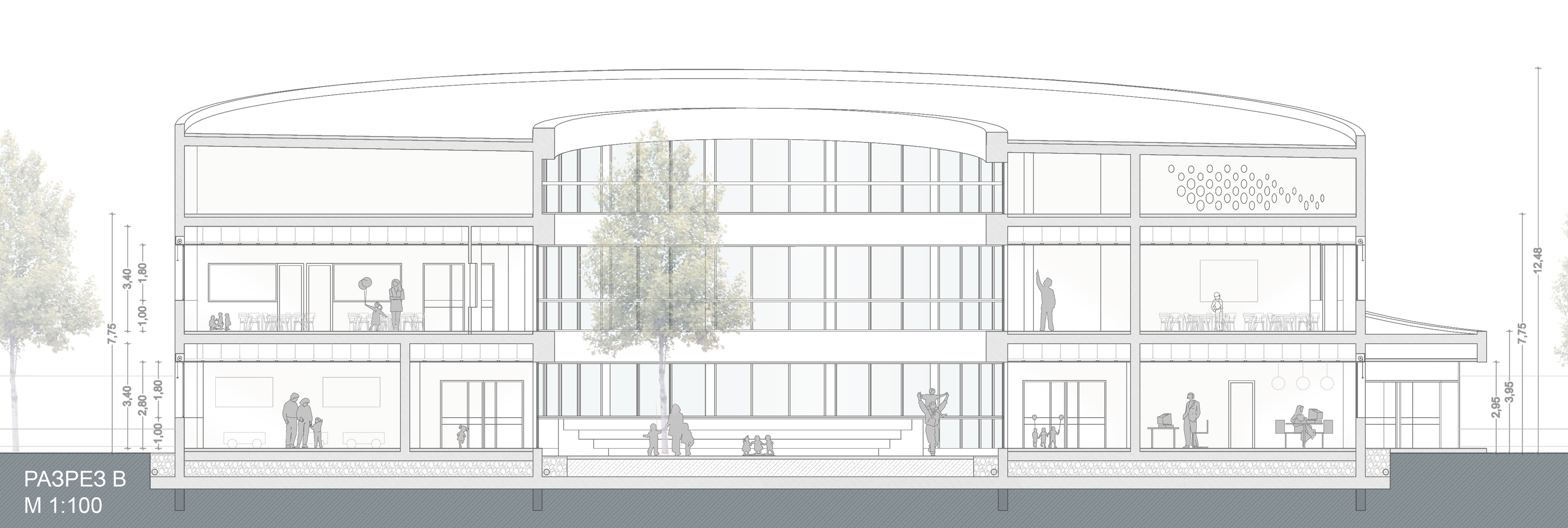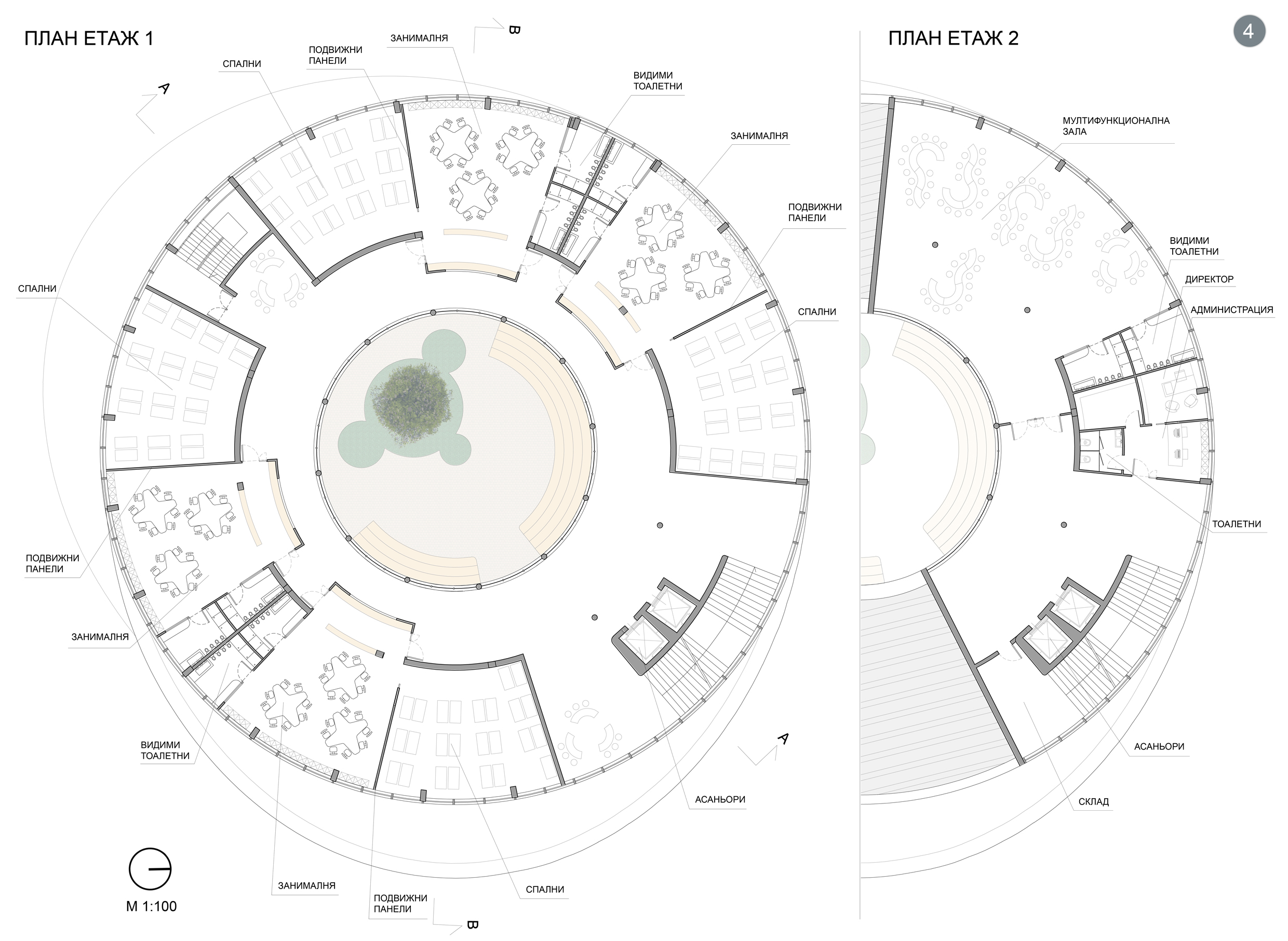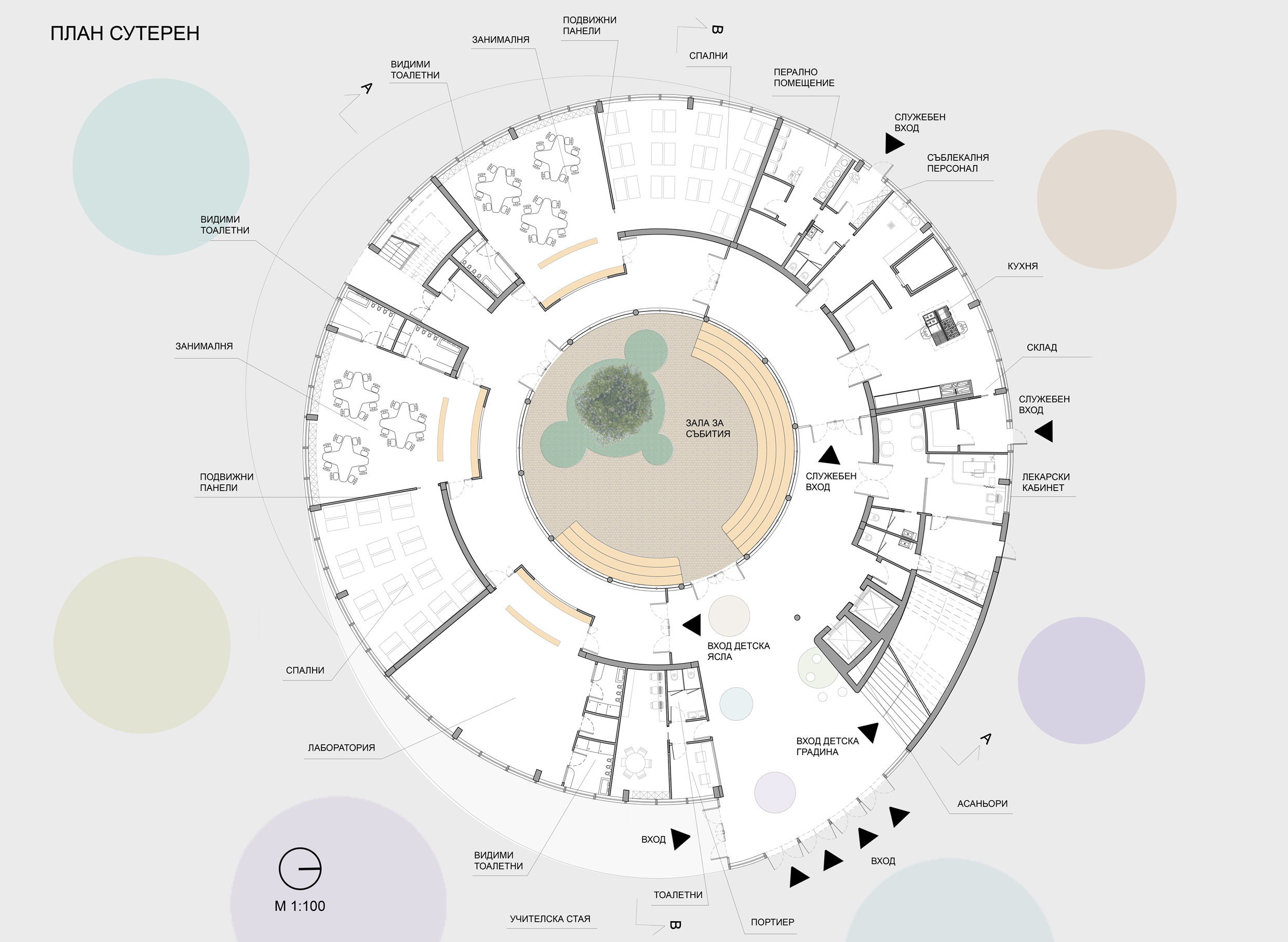 1. Paesaggio, edificio e bambini. Sulla base dei principi formulati nel bando di concorso, il progetto cerca una nuova percezione dell’architettura per i bambini. La “geometria” è introdotta nel nostro design come termine primordiale. “La prima cosa che disegna un bambino assomiglia ad un cerchio”.